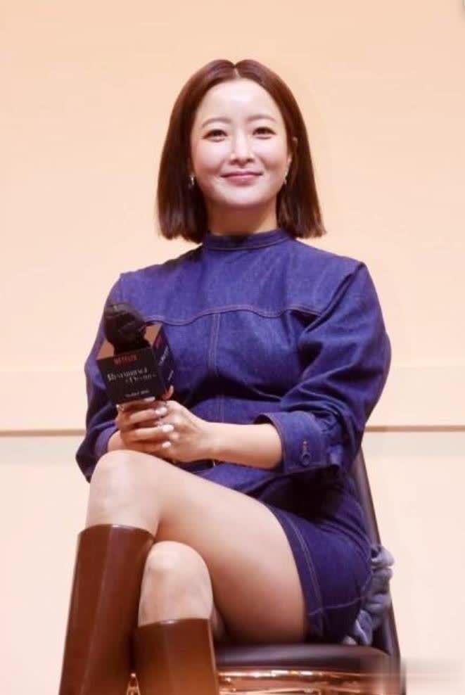下半身搭配棕色漆皮长靴,亮面材质在灯光下泛高级光泽,靴筒刚好包裹小腿,保暖又修饰腿型,与牛仔裙的蓝色形成温暖撞色,中和了牛仔的硬朗,增添了几分女人味。发型上,金喜善换了干净利落的短发造型,与整套造型的飒爽感相得益彰,整个人完全看不出年龄感。